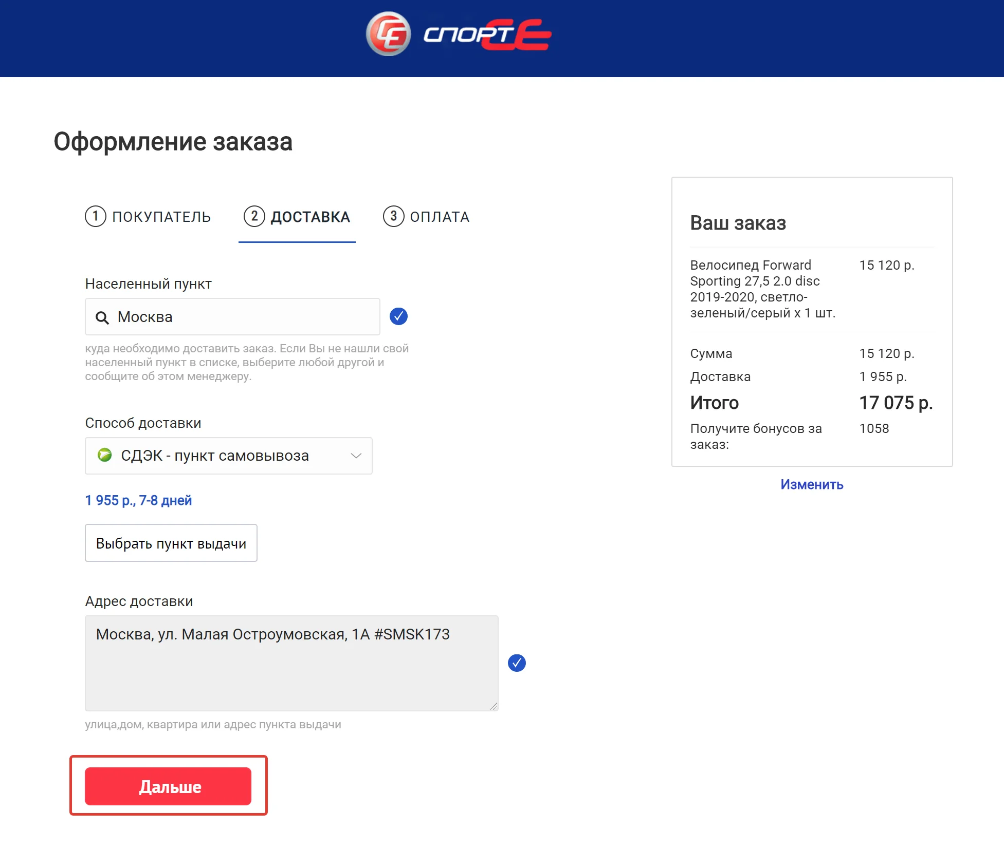 После выбора пункта самовывоза поле адреса автоматически заполнится, затем необходимо нажать кнопку "Дальше"