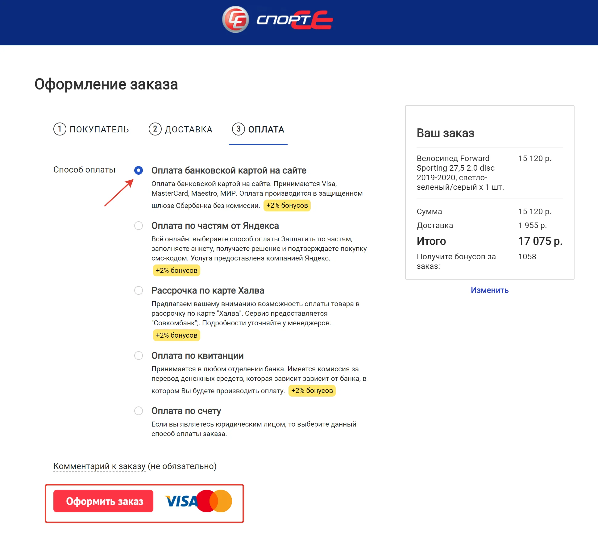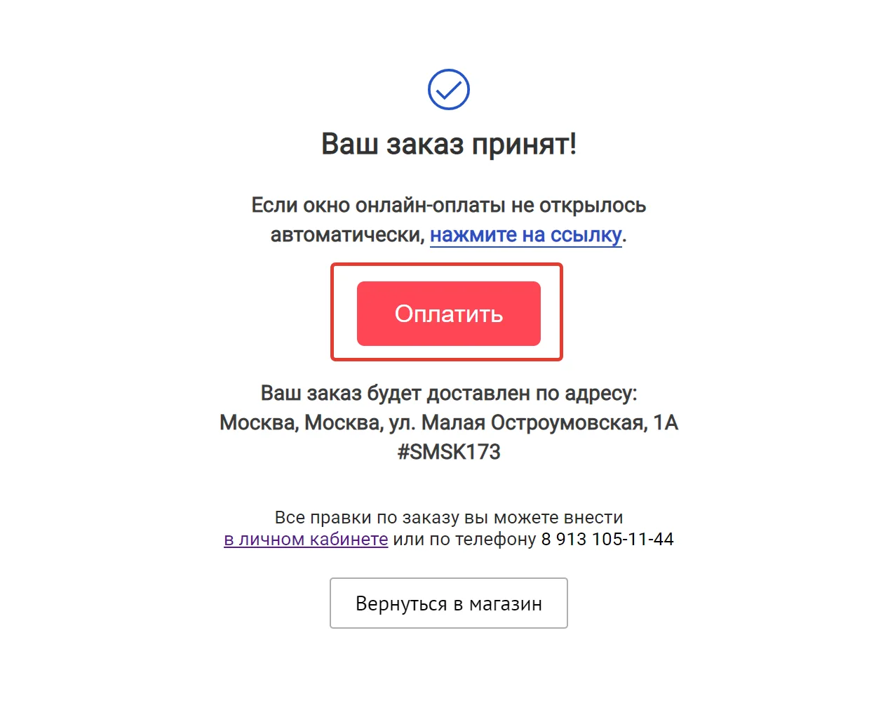 Если все условия по доставке и оплате вам понятны, вы можете переходить к оплате заказа. Для этого необходимо нажать на кнопку "Оплатить".