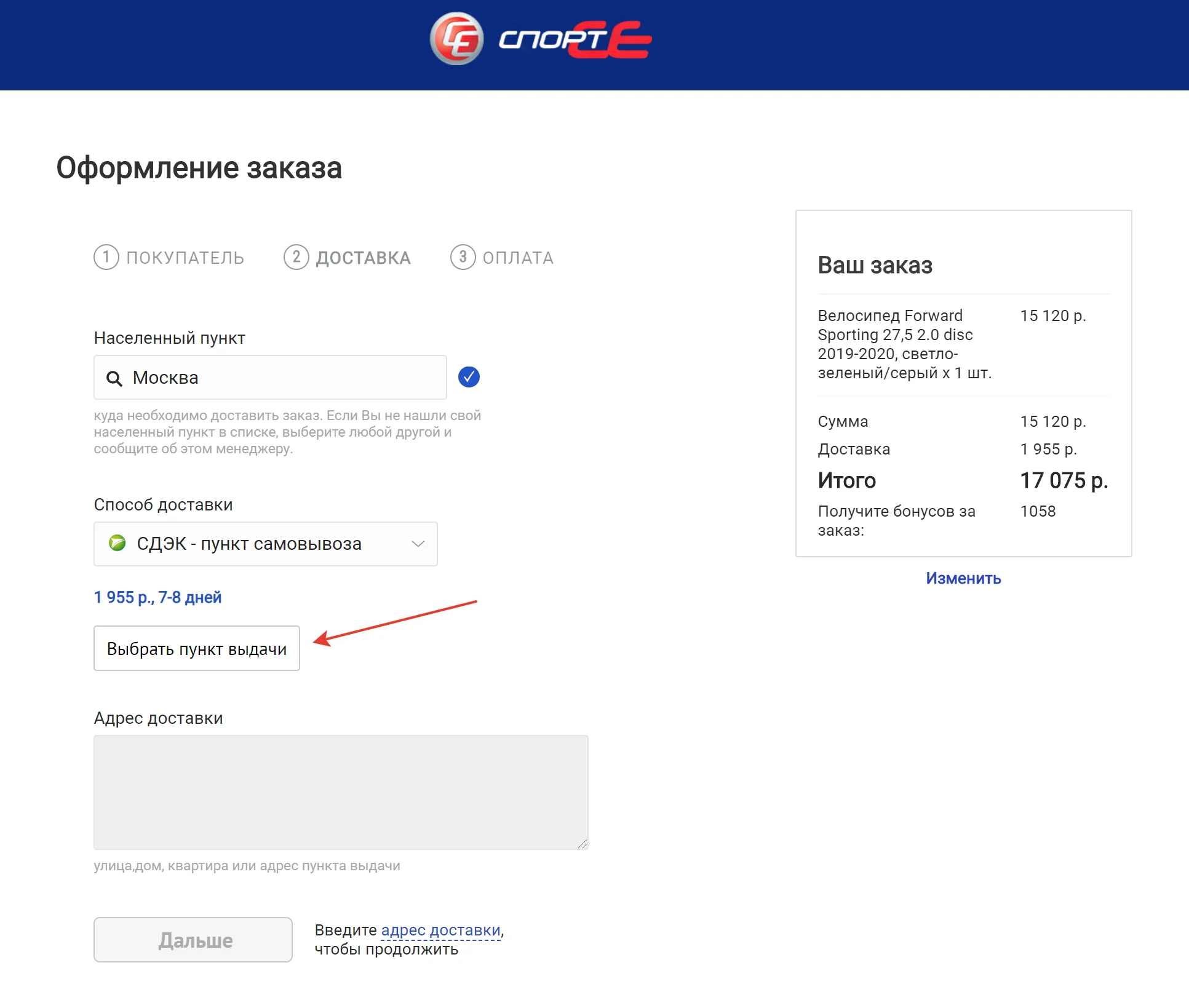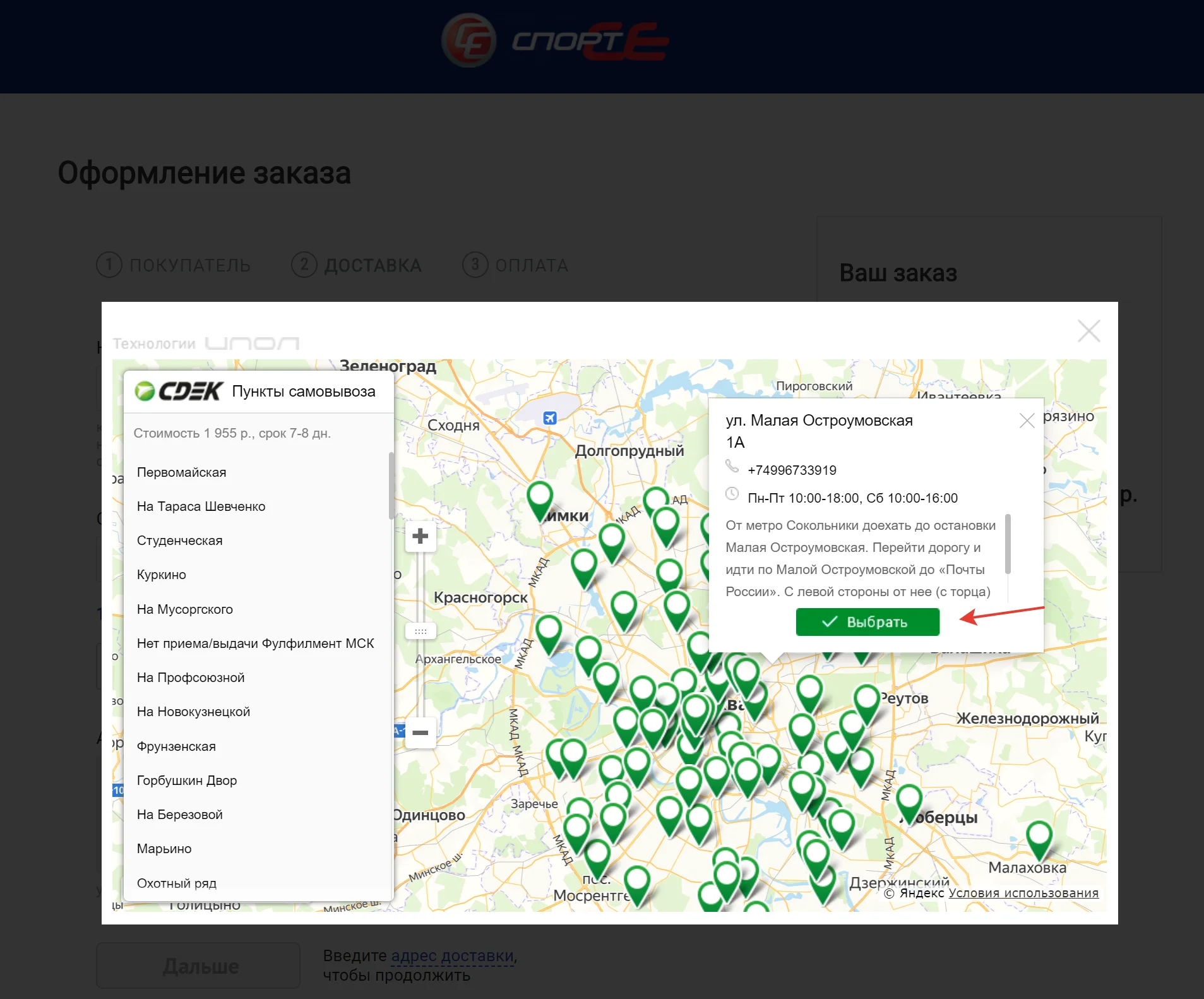 В случае транспортной компании СДЭК вам также необходимо указать пункт самовывоза, где вы заберете свой заказ